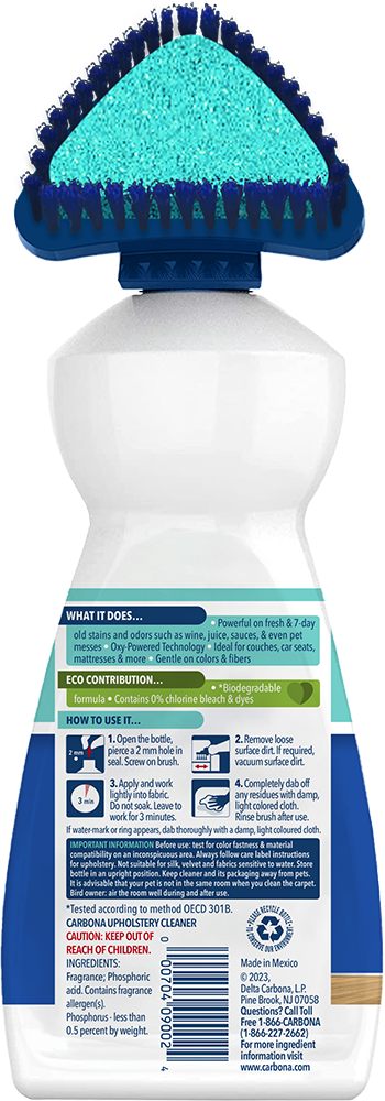 Oxy-powered formula lifts fresh and dried stains from couches, car seats, mattresses, strollers, and more.