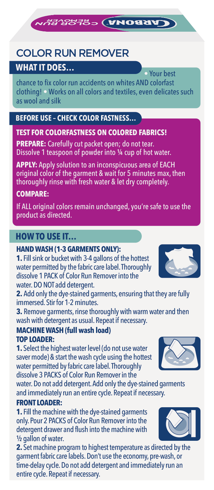 1. Fill sink or bucket with 3-4 gallons of the hottest water permitted by the fabric care label. Thoroughly dissolve 1 PACK of Color Run Remover into the water. DO NOT add detergent.